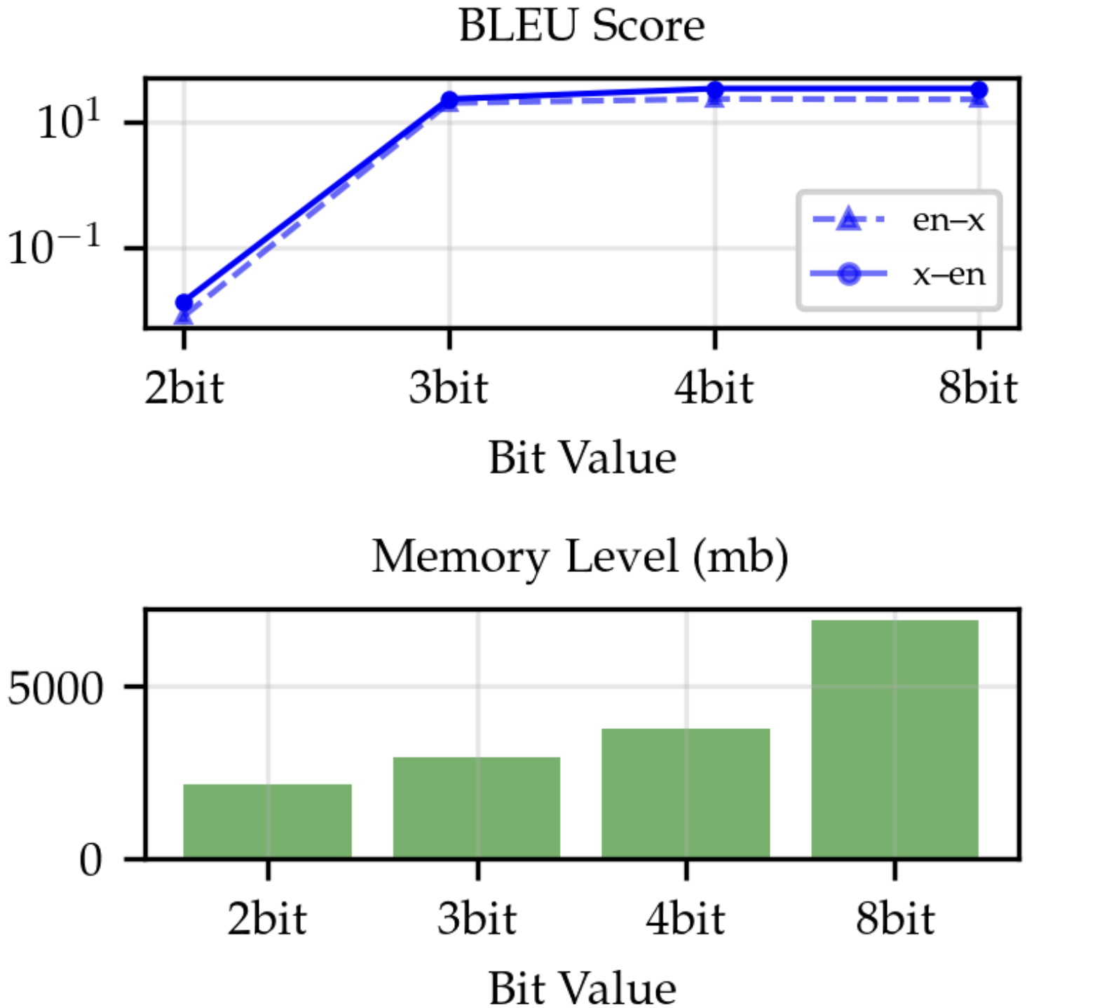 en ↔ x. Additionally, we cover the average time per token in seconds (↓) and the memory allocation in megabytes (MB) (↓) after each compression technique is applied. Quantization