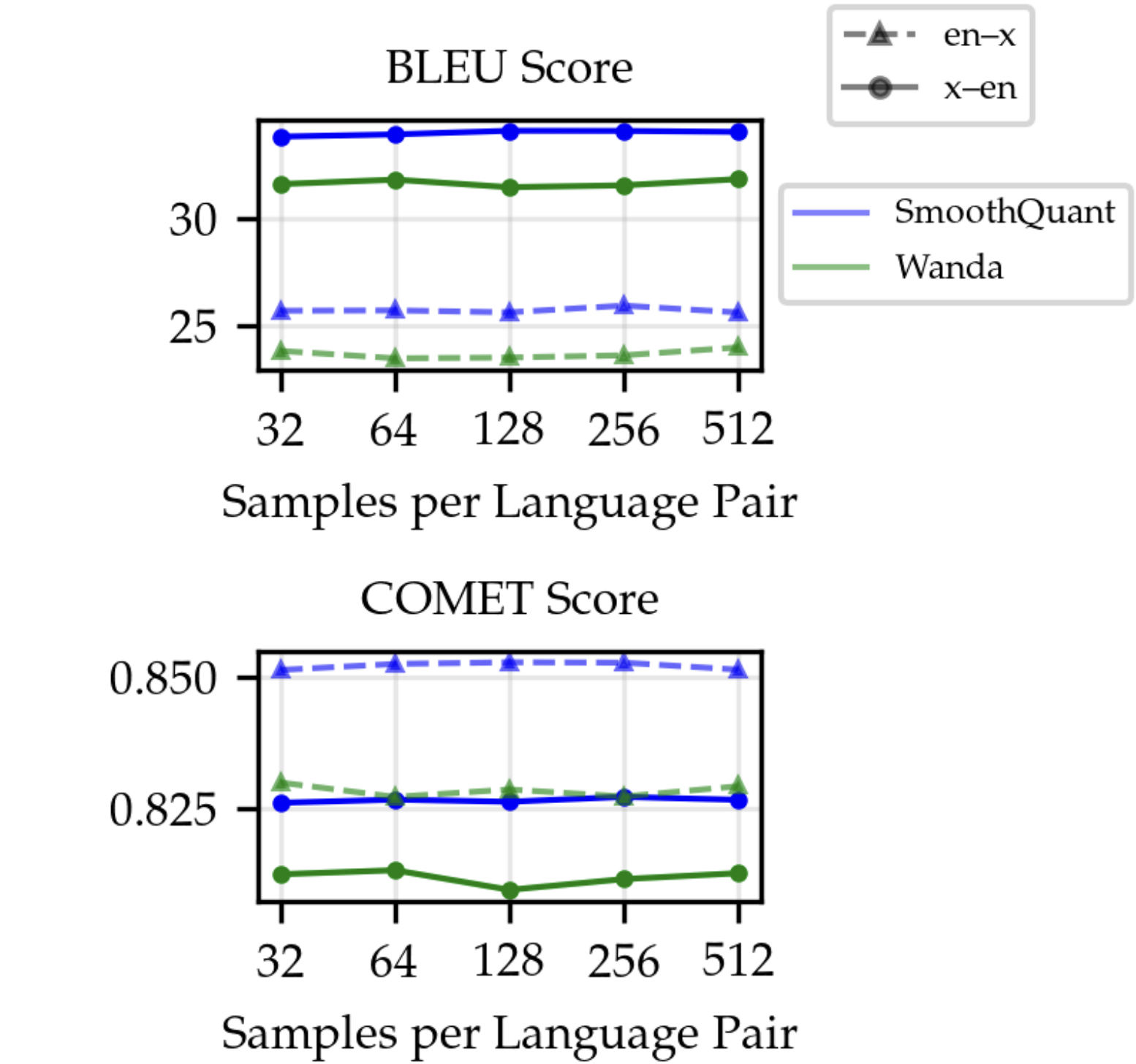 In Figure 2 we report our expeirments on calibration data. These showed minimal performance differences across varying sample sizes, suggesting that translation models depend mainly on pattern recognition and word mappings, which smaller datasets can capture effectively. Since calibration is a one-time post-training step, using the best-performing setup (512 samples per language) is acceptable despite higher latency. However, as model size increases, calibration becomes computationally expensive, highlighting the advantage of methods like Q-LoRA, which bypass the calibration step entirely.