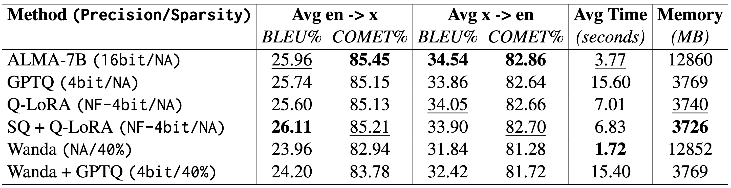 Wanda pruning achieved lower BLEU scores but offered faster inference and reduced memory use compared to the full ALMA-7B model (5th Row Table 1). However, its memory savings were less substantial than quantization, since pruning zeros out weights rather than compressing them. The resulting sparsity speeds up computation but does not reduce the number of operations.