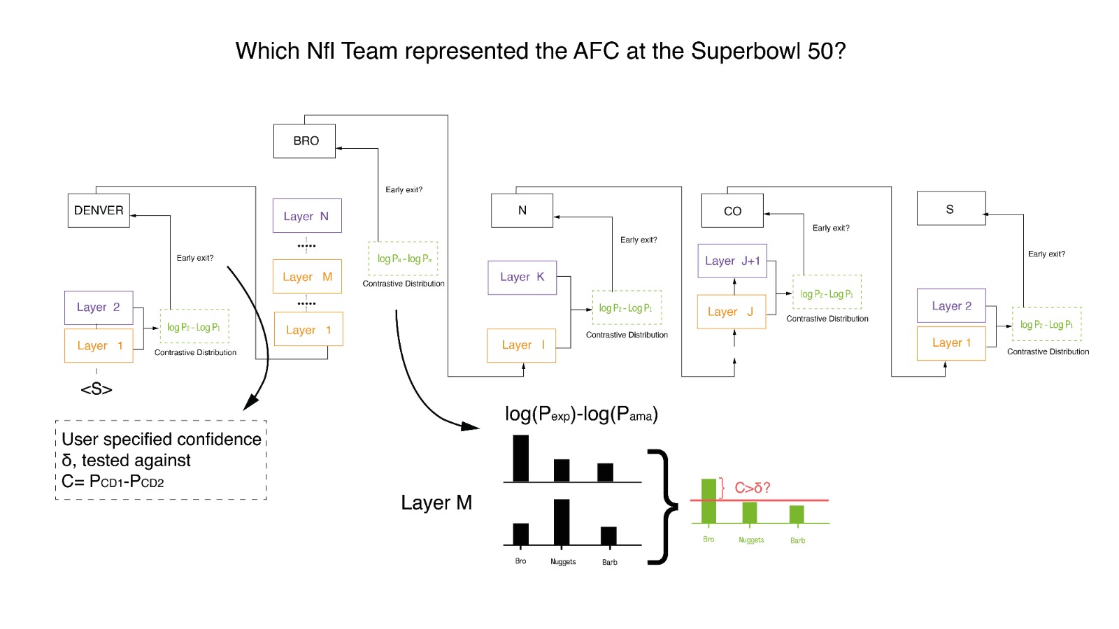 Contrastive Decoding (Li et al., 2023) is a technique proposed to reduce unwanted behaviors in LLMs such as hallucinations, repetition, and incoherence. The method employs two models, a smaller one called amateur, and a larger one called expert. They both perform auto-regressive text generation on the same data, and the final predicted token is selected based on the output difference between the predictions of the expert and amateur. However, employing two LLMs is highly inefficient, both in terms of memory and compute. Alternative methods have been proposed, which employ the contrastive decoding scheme, without the necessity of using two models. An example of such work is the idea of Auto-Contrastive Decoding (Gera et al., 2023). The authors show how contrasting outputs of different layers within the same model can benefit text generation outputs. The study shows that predictions of shallow layers can help those of deeper ones to attain better results. Other studies have adapted this technique to different tasks such as reducing hallucination in LLMs (Chuang et al., 2024). Our proposed contrastive decoding techniques are based on both Gera et al. (2023) and Chuang et al. (2024) and adapted to the aforementioned early-exiting framework of Schuster et al. (2022).