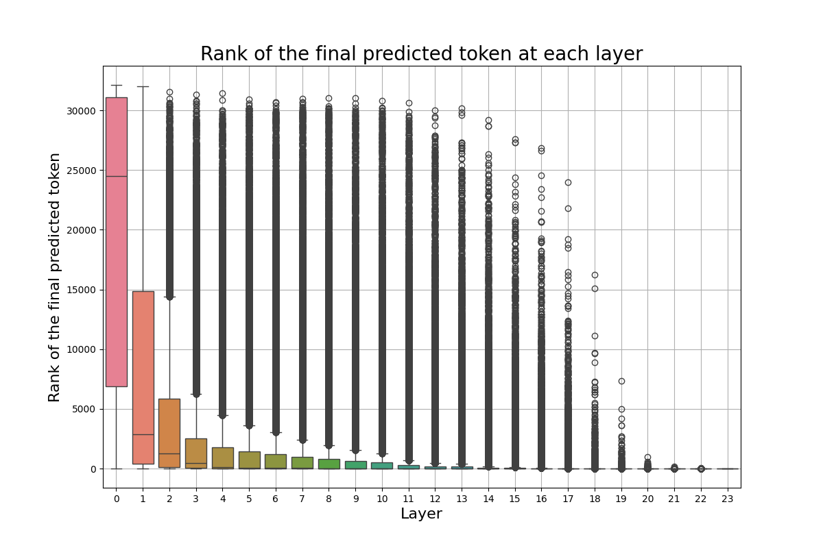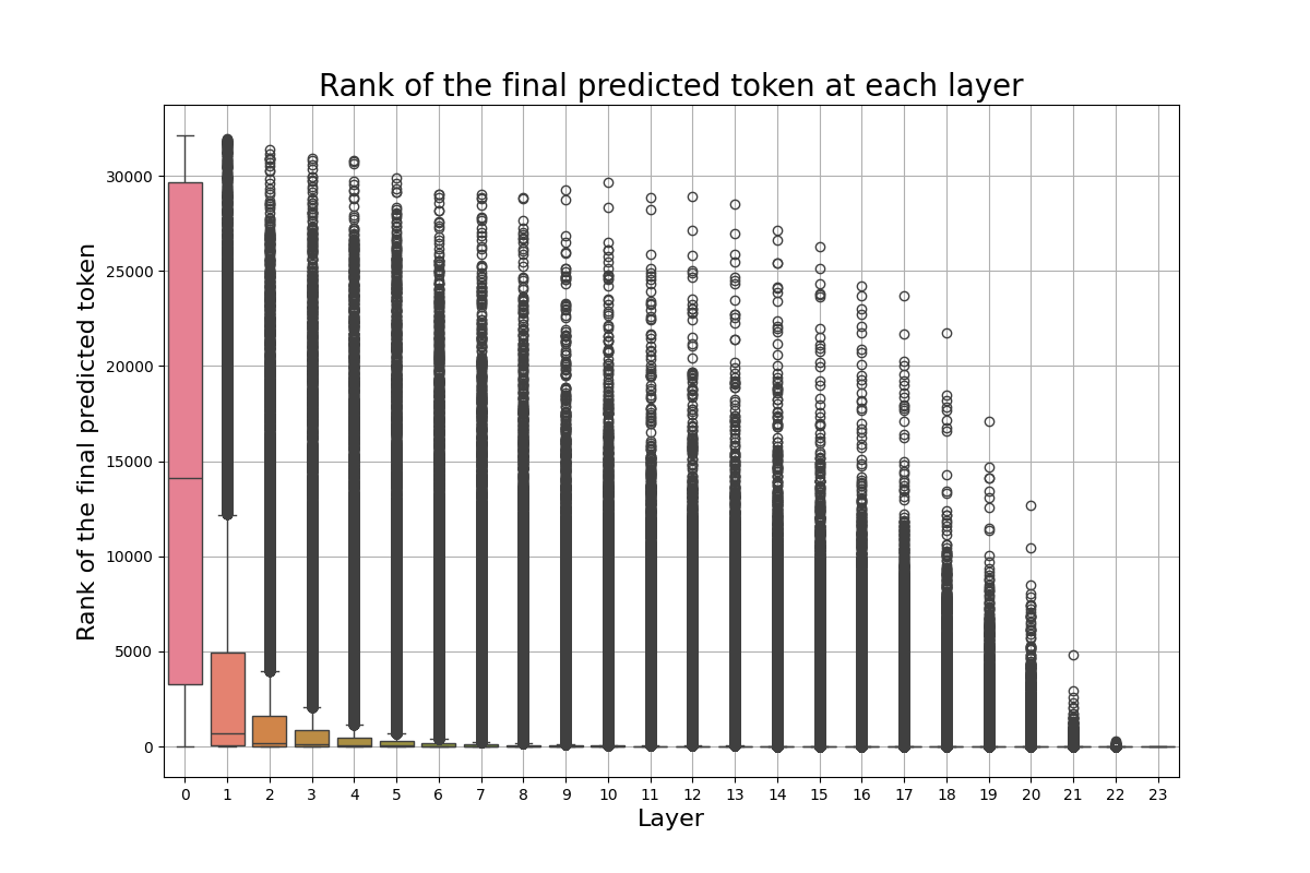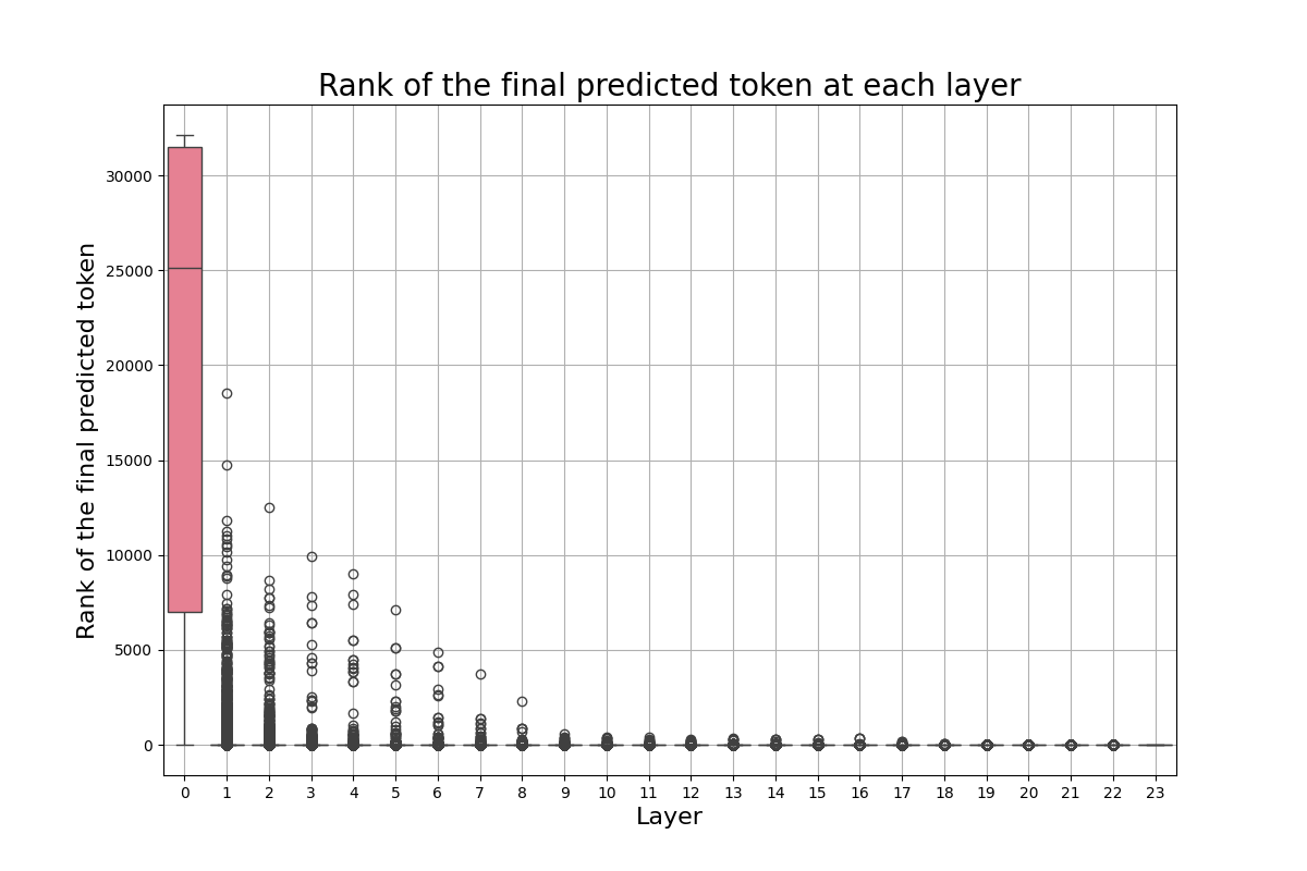 To summarize, our final predicted token is often highly ranked across all layers. Due to this, pruning the vocabulary matrix allows us to reduce the amount of computations at each block, discarding only irrelevant tokens. While we may potentially trade-off some performance, this further speeds up the runtime of our model, allowing us to obtain considerable efficiency gains.
