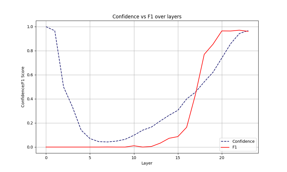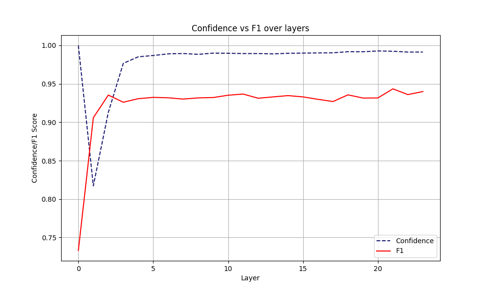 Recall that $\mathbf{W_\ell} \in \mathbb{R}^{d_{\text{vocab}} \times d_{\text{model}}}$, where $d_{\text{vocab}} \approx 32000$ is our vocabulary size, and $d_{\text{model}}$ is equal to the size of the last hidden representation of our FFN. Both parameters are on a scaling upward trend in SOTA architectures. We argue that most of these computations are redundant, and potentially not necessary for some tasks. In Figure 2, we show the boxplots for the rank of the final predicted token at each layer, across not fine-tuned and fine-tuned models, for two different datasets. The main takeaway from these images is that the final predicted token is often already highly ranked from the first few layers of our model. This behavior is more explicit in Figures 2b and 2d, where we use fine-tuned models on our downstream tasks. On the other hand, confidence alone can be a deceiving measure. LLMs can be overconfident in the first layers, causing the model to exit prematurely. Our desiderata is for the model to be confident at the same time when its prediction has a high accuracy, that is, to be calibrated. However, we interestingly note that such behavior is rarely observed at early layers. In Figures 3 and 4, we see the accuracy and the confidence across each layer. The model in the first layers presents an anomalously high confidence, while its performance is still poor. Early exiting only based on the Softmax response would result in bad performance. We decide to set a minimum exit layer parameter $j$, which forces the model to consider exiting only after this layer. Note that this parameter is highly dependent on the model and dataset one experiments on. For fine-tuned models for example, one expects this parameter to be smaller.