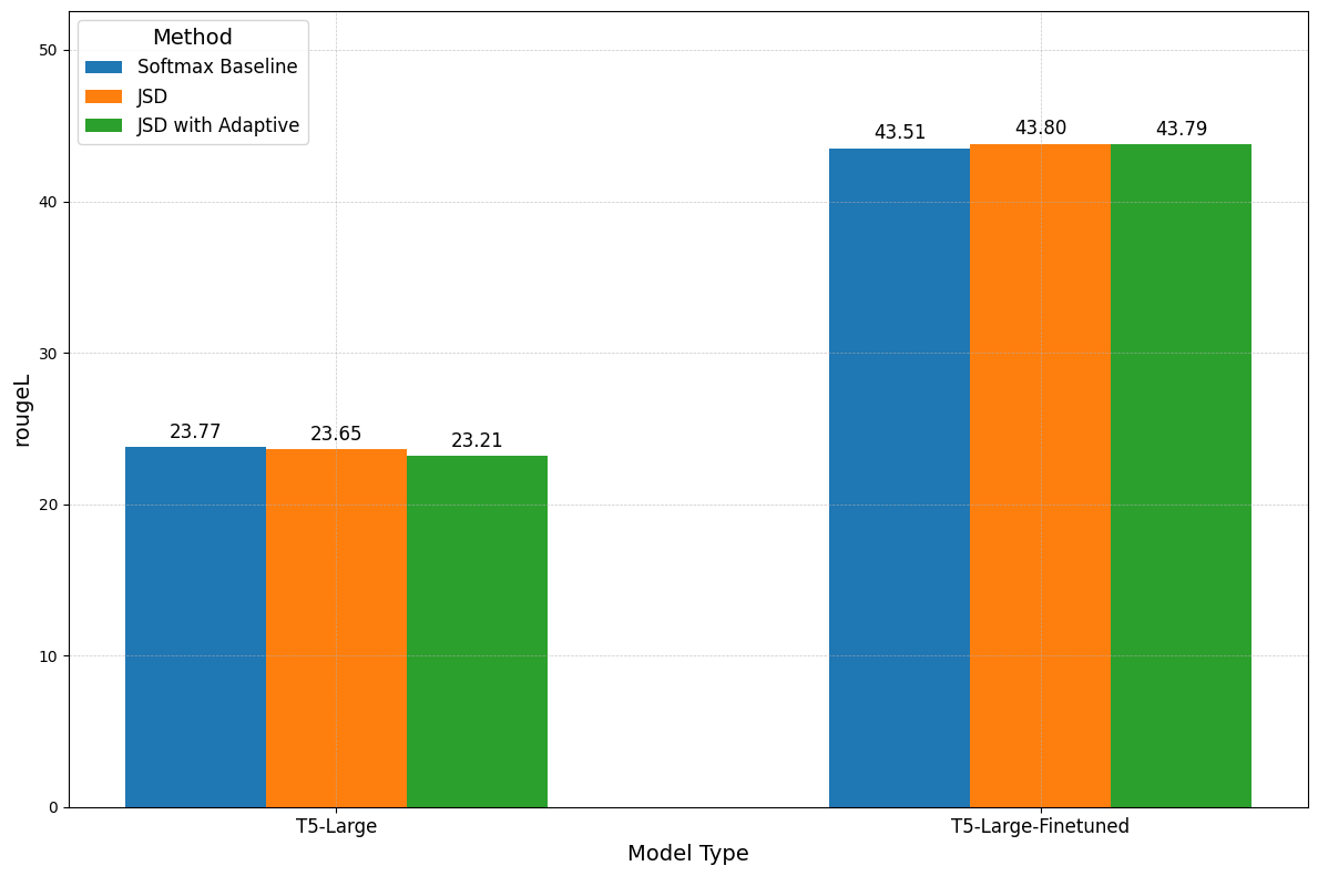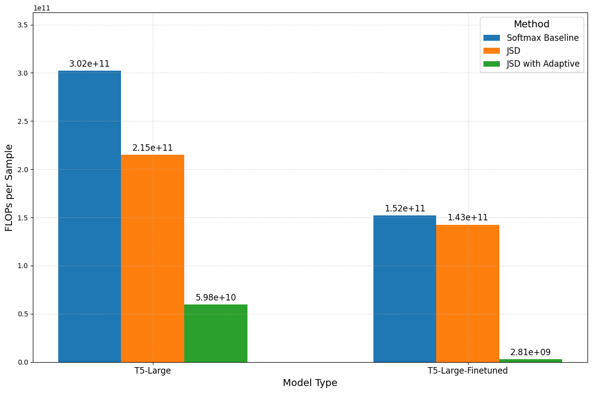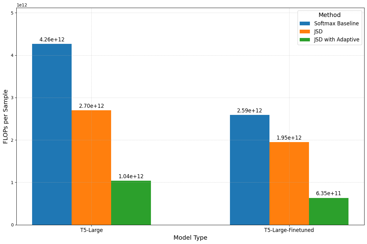 In “Softmax Speed-Up” we show the considerable impact the pruning approach has on FLOPs. Similarly, Figures 10 and 11 show that removing a large number of tokens has a notable effect on compute, reducing it by almost 100 times on SQuAD and 10 on SamSum between JSD baseline and JSD with adaptive pruning. This gap is also more noteworthy when looking at the amount of performance retained. On both fine-tuned and non-finetuned models the decrease in performance between the downstream tasks is never more than 1.5%, with JSD. Lastly, we highlight the difference in results between Figure 7, 8, and Figure 10, 11, due to a higher minimum exit layer selected for the former experiments. However, in both cases, our results are consistent both in trend of terms and performance and FLOPs reduction.