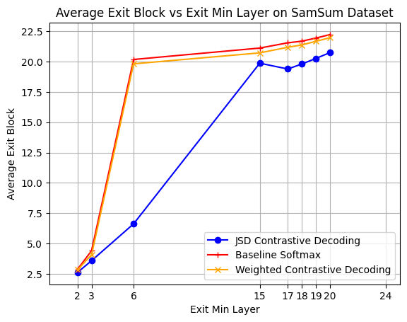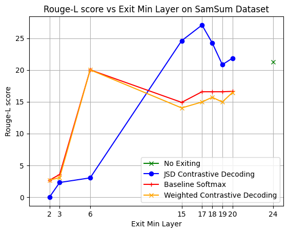 Evaluation on SamSum dataset, Figure 10, shows notable results. While Weighted Contrastive Decoding is on par with the Softmax baseline, the JSD confidence measure is exiting earlier on average, with a 2.9 block gain against Softmax (red line). Additionally, JSD is attaining an approximate 10\% increase in Rouge-L performance if setting the minimum exit-layer to 17.