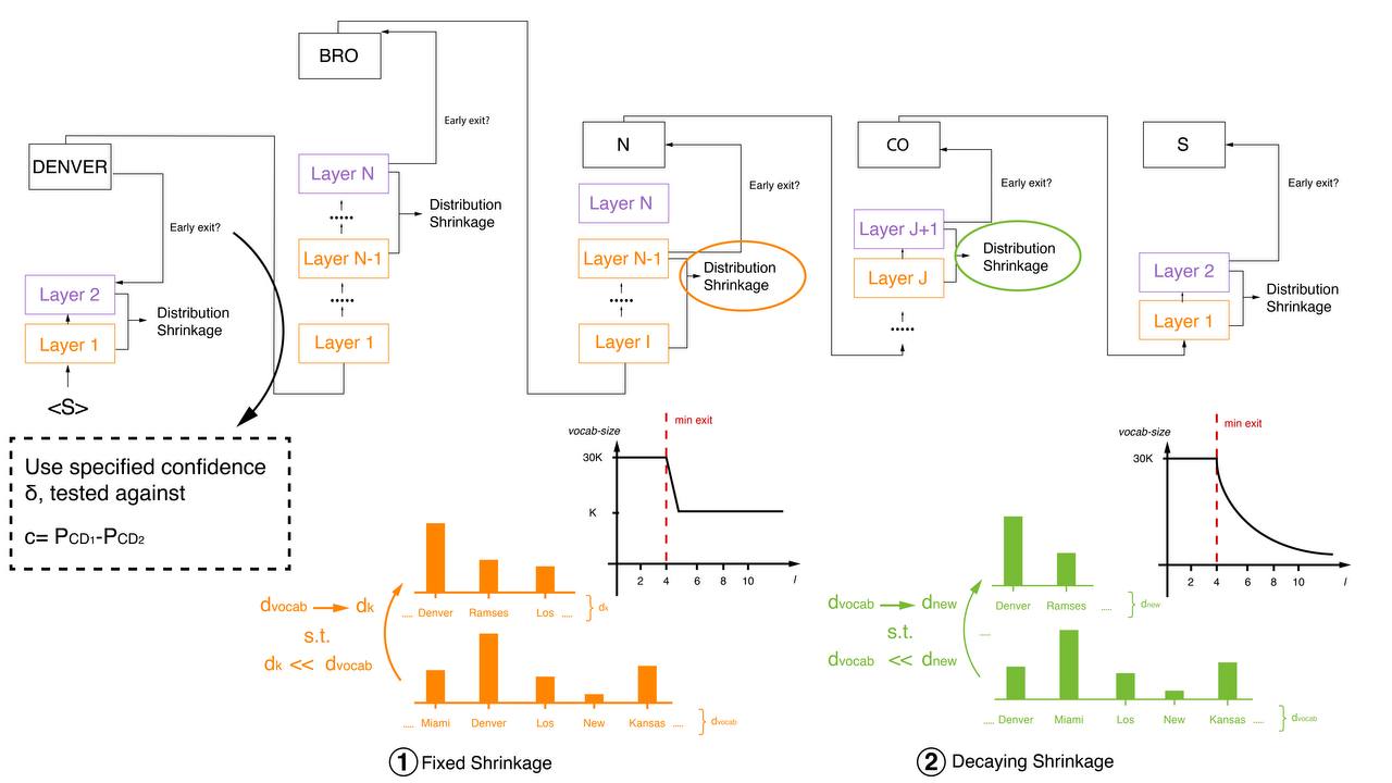 \[c_{t+1}^{\ell} \geq \tau_{t+1}^{\ell}\]the model exits early, providing us with the prediction for the next token computed at layer $\ell$. Otherwise, it continues by going into the next Transformer block. However, the matrix multiplication inside Softmax, i.e., $\mathbf{W_\ell} h_{t}^{\ell}$ is computationally expensive, especially when iterated over multiple layers. The exact number of Floating Point Operations (FLOPs) for the above corresponds to $d_{\text{model}} \times d_{\text{vocab}} \times L$. Hence, by pruning the vocabulary size at the first layer from $d_{\text{vocab}}$ to $k$, the number of computations required will reduce to $d_{\text{model}} \times k \times L$.