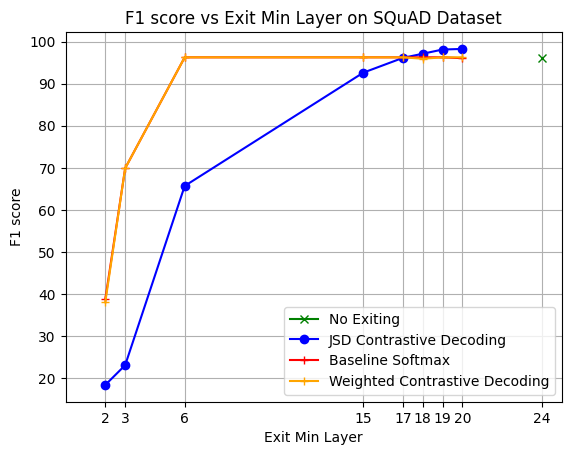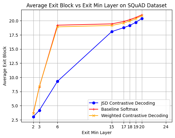 Results from Figure 9 show Weighted contrastive decoding achieving comparable average exit layer with Softmax baseline by (Schuster et al., 2022), while still retaining almost all the performance. More interesting is the behaviour of JSD, which consistently beats the Softmax baseline. The method is exiting earlier with an average gain of 2.5 blocks, while also achieving higher performance with a 2\% increase over the no-exiting baseline (green dot).