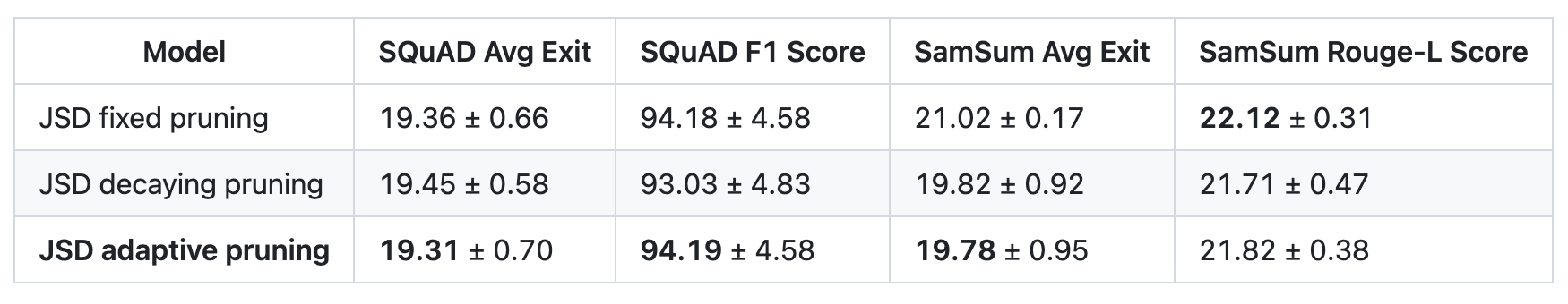 Following the argument in “Contrastive Decoding”, we observe that the model is most performant when the minimum exit layer is selected to be among the latest ones. Keeping this in mind, Table 1 shows the average exit layer and score of the model. Both are averaged across these sensible minimum exit layers. We note that combining Adaptive Pruning with JSD beats the performance of JSD combined either with Fixed or Decaying pruning. It also obtains an average gain of 1.2 blocks against Fixed pruning on SamSum. However, JSD+Fixed achieves the highest Rouge-L score in SamSum. Given the considerations above, we choose Adaptive to be the most fitting pruning method to combine with the JSD confidence measure. We defer to Appendix A a series of detailed plots indicating all minimum exit layers in this setting.